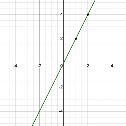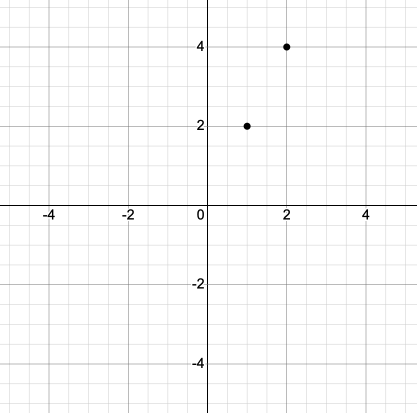 Given the function [latex]f\left(x\right)=2x[/latex], we might use the input values [latex]1[/latex] and [latex]2[/latex].[latex]\\[/latex] Evaluating the function for an input value of [latex]1[/latex] yields an output value of [latex]2[/latex] which is represented by the point [latex](1, 2)[/latex]. [latex]\\[/latex]Evaluating the function for an input value of [latex]2[/latex] yields an output value of [latex]4[/latex] which is represented by the point [latex](2, 4)[/latex].Plot each point on the coordinate plane: